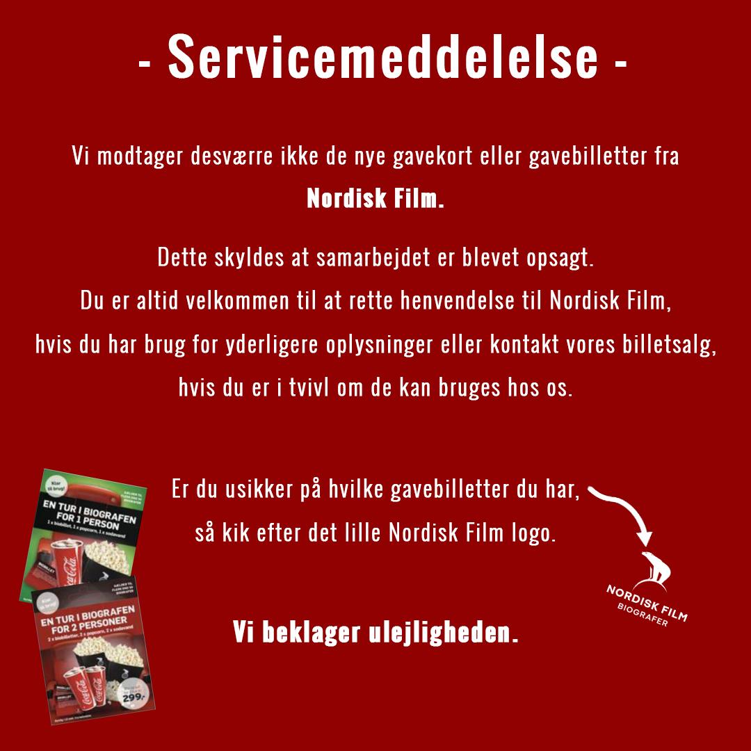 Beløbsgavekort (gavekort på specifikt beløb) fra Nordisk Film, samt gavekort udstedt specifikt til Nordisk Film Biografer, må Nordisk Film desværre kun selv tage imod, hvorfor vi ikke kan indløse disse.